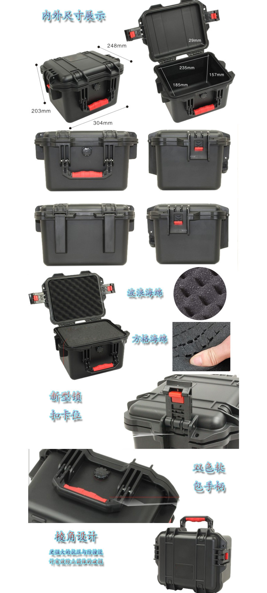 簡(jiǎn)要說明:廣泛用于傳媒、公安、消防、軍隊(duì)、航空、戶外攝影、野外考察、科學(xué)探測(cè)等眾多領(lǐng)域的高端儀器、儀表。具有高強(qiáng)度、高抗壓沖擊、防潮、絕對(duì)密封、防塵、防水等特點(diǎn)。產(chǎn)品材質(zhì):ABS原料,箱體采用高抗沖擊的高分子聚合材料一體注塑成型,密封采用扁型彈性發(fā)泡密封橡膠條,確保防水氣密,所有較軸均采用不銹鋼材質(zhì)。