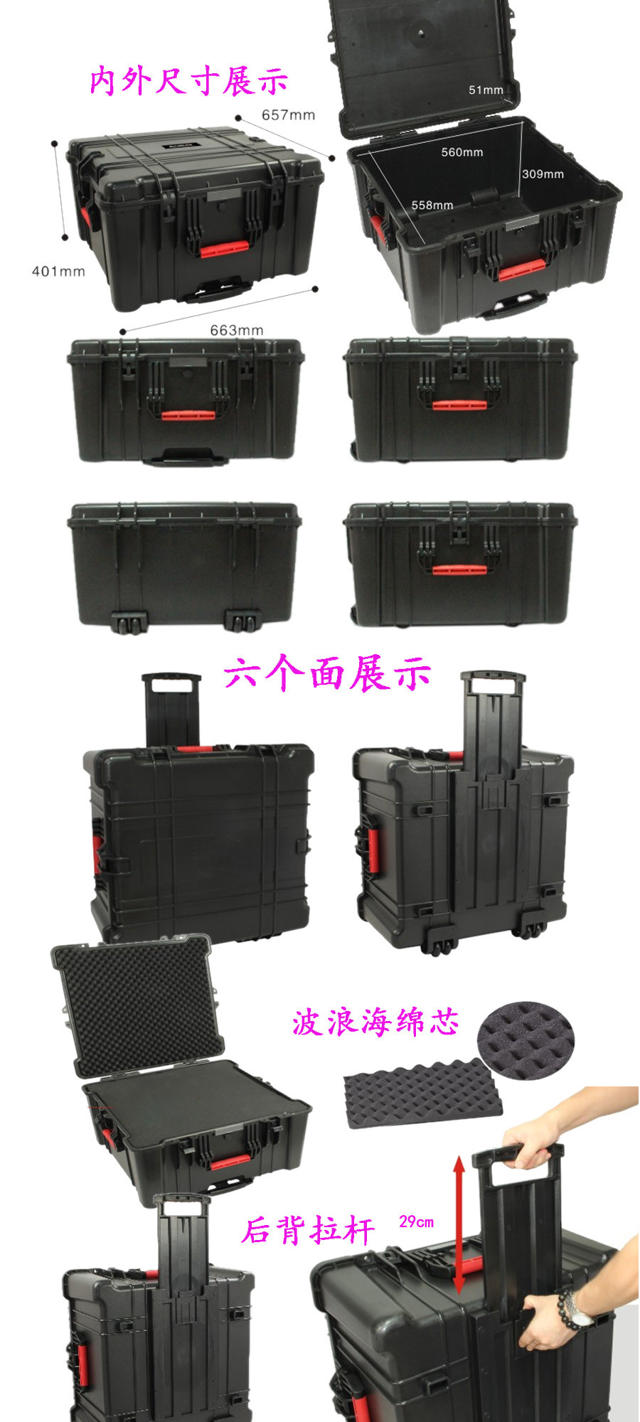 簡(jiǎn)要說(shuō)明:廣泛用于傳媒、公安、消防、軍隊(duì)、航空、戶外攝影、野外考察、科學(xué)探測(cè)等眾多領(lǐng)域的高端儀器、儀表。具有高強(qiáng)度、高抗壓沖擊、防潮、絕對(duì)密封、防塵、防水等特點(diǎn)。產(chǎn)品材質(zhì):ABS原料,箱體采用高抗沖擊的高分子聚合材料一體注塑成型,密封采用扁型彈性發(fā)泡密封橡膠條,確保防水氣密,所有較軸均采用不銹鋼材質(zhì)。